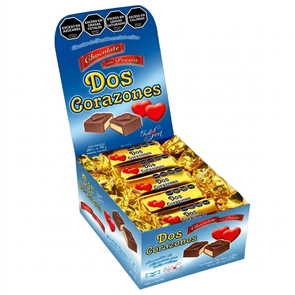El Dos Corazones x 20 unidades es el bombón relleno con crema que incluye una frase romántica. Un clásico del amor y el sabor argentino.